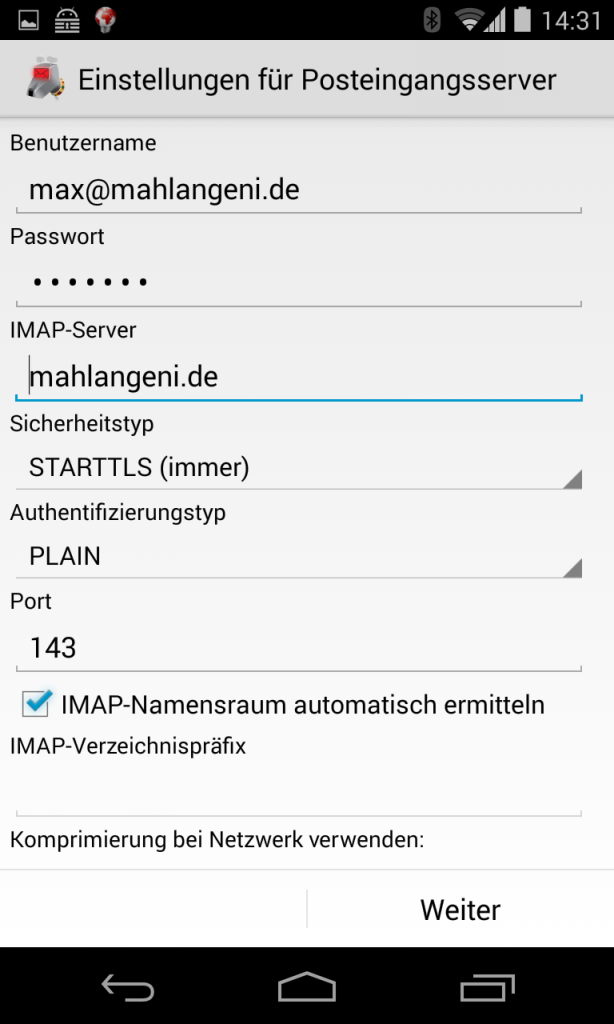 - Trage als IMAP-Server imap.mahlangeni.de ein