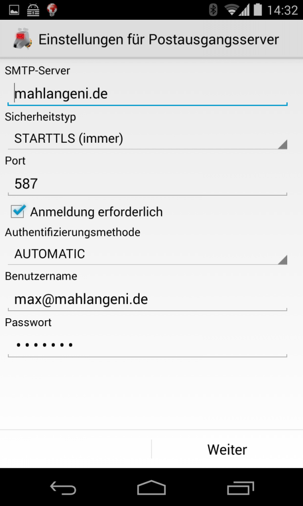 - Trage als SMTP-Server smtp.mahlangeni.de ein